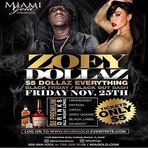 Miami Gold Proudly Presents: Zoey Dollaz featuring the sounds of DJ Seizure Friday November 25th. Tickets for this Hype Event only 5$. Don't be left out on this experience. For More Information Please Call 1-305-944-4204