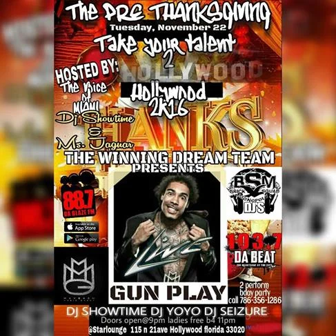 You Heard It Right !!!! Hip Hop Icon Gun Play stops by The Star Lounge on Tuesday November 22nd for The Pre Thanksgiving Eve Event "Take Your Talent 2" featuring the sounds of DJ ShowTime, DJ YoYo and DJ Seizure. This event is selling out fast. Grab Your Tickets Today !!!!!!