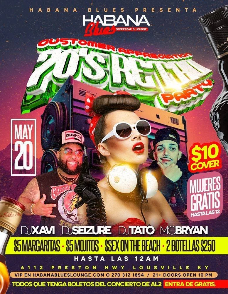 Miami Vibez Latin Night (Habana Blues) Saturday, May 20, 2023 10:00 PM Sunday, May 21, 2023 4:00 AM Habana Blues Nightclub 6112 Preston Highway Louisville, KY, 40219 United States (map) Google Calendar ICS DJ Seizure is back at Habana Blues Satyurday Nights for Miami Vibes alongside DJ Xavi & DJ Tato! We’re bringing a whole new vibe to the city! All your favorite Perreo Hits along with Dembow, Salsa, Merengue, Bachata, house, Top 40, HipHop & Reggae.