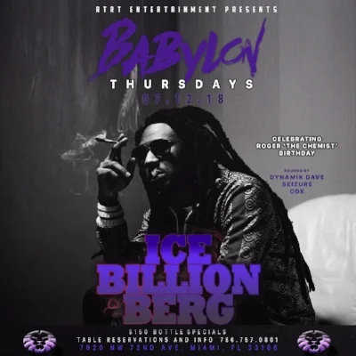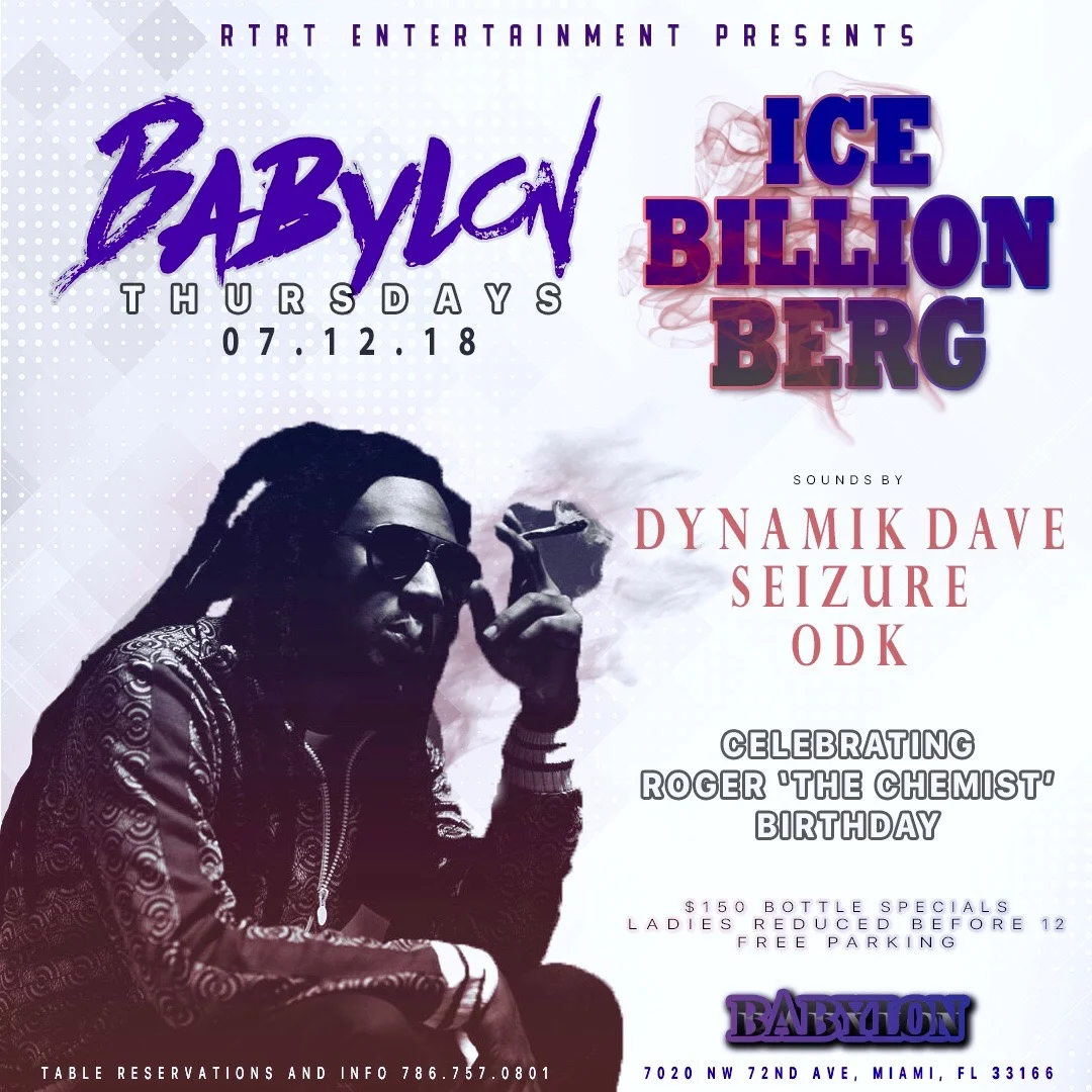 Thursday July 12 Iceberg invades Babylon Miami for "Babylon Thursdays" as we celebrate Roger "The Chemist" Birthday | Sounds by DJ Seizure, Dynamik Dave & ODK