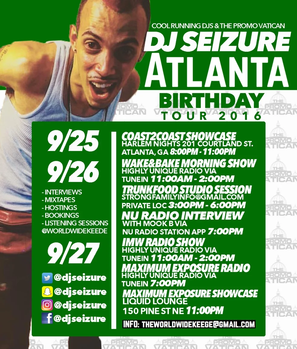 DJ Seizure finishes off his Birthday Tour in Atlanta. After kicking off his 30th Birthday in Miami DJ seizure travels to Jacksonville for the Navy Barracks Bash and now wrapping up his tour in Atlanta.