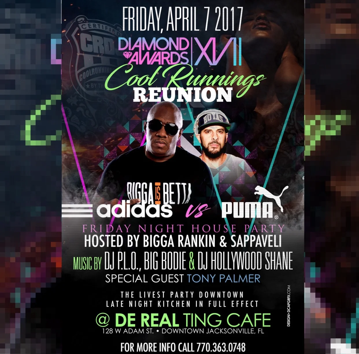 Fri April 7, 2017 Da real Ting Cafe and Diamond Awards XVII Adidas vs Puma Cool Runnings Reunion.