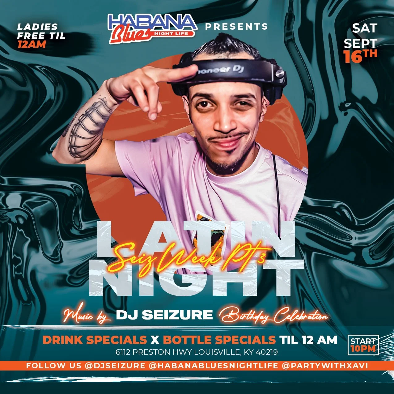 DJ Seizure Birthday Bash at Habana Blues Saturday, September 16, 2023 10:00 PM Sunday, September 17, 2023 4:00 AM Habana Blues 6112 Preston Highway Louisville, KY, 40219 United States (map) Google Calendar ICS