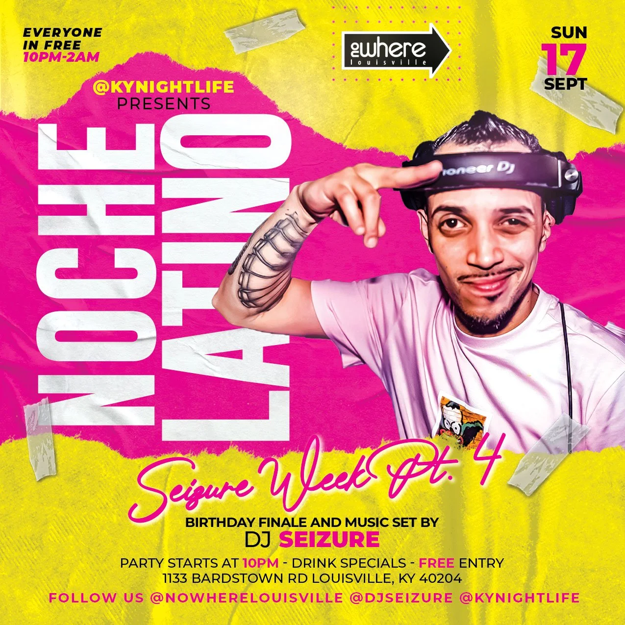 Latin Sundays at Nowhere Bar Louisville are the ultimate fiesta! Join us for an unforgettable night with free entry for everyone. The party starts at 10 PM, and the beats will be pumping all night long with Miami's very own D.j. Seizure ! Get ready to dance your heart out!