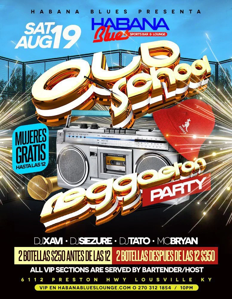 Old School Reggaeton Night Saturday, August 19, 2023 10:00 PM Sunday, August 20, 2023 4:00 AM Habana Blues Nightlife 6112 Preston Highway Louisville, KY, 40219 United States (map) Google Calendar ICS