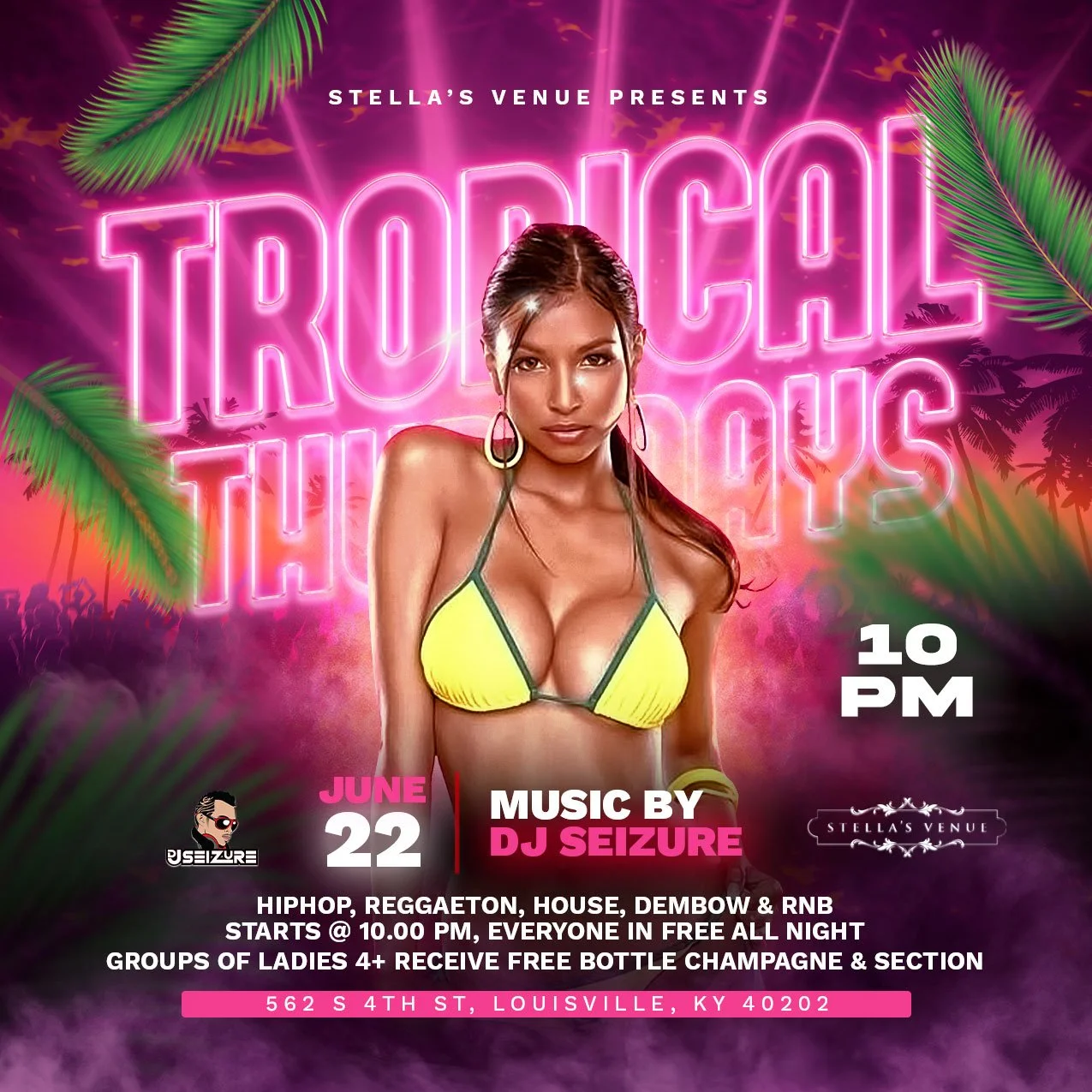 Come make your Thursdays better than ever with Tropical Thursdays at Stella's Venue in Downtown Louisville! Miami's own DJ Seizure will be providing the hottest beats to get you dancing and grooving all night long.